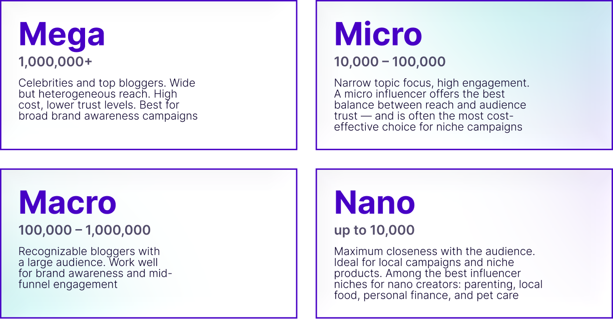 Before you start searching, it's important to understand the influencer meaning in modern marketing: choosing an influencer is not a matter of taste β it's a matter of goals. Audience size, engagement level, and the nature of the connection with followers dramatically affect your influencer campaign strategy.