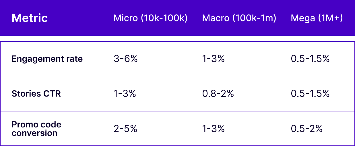 Micro influencers (10,000β100,000 followers): engagement rate 3β6%, Stories CTR 1β3%, promo code conversion 2β5%.