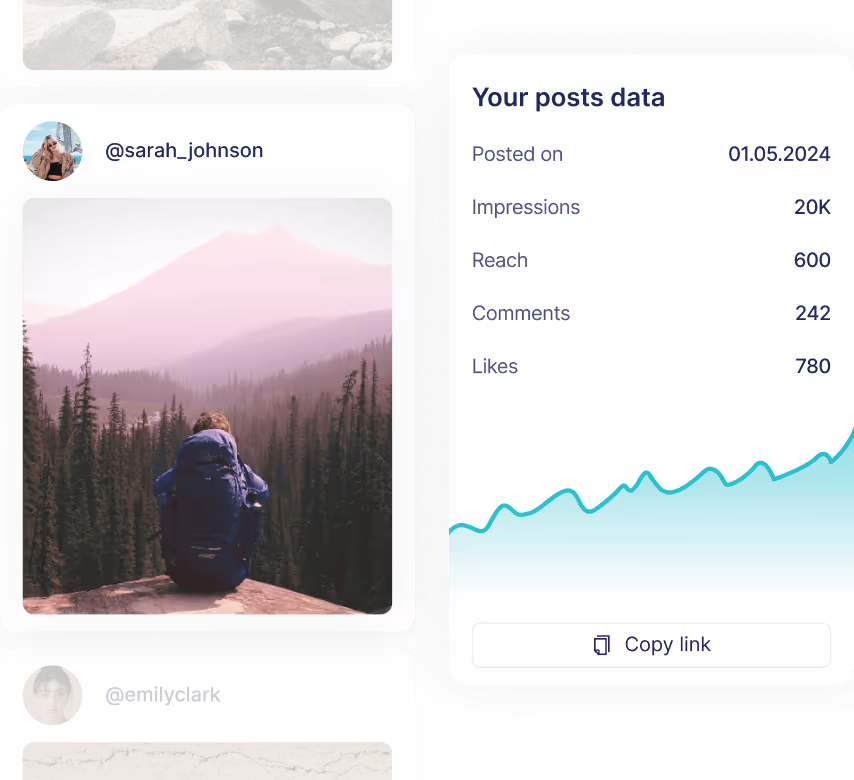 Watch campaign performance in real time with all data pulled automatically into your dashboard. Focus only on whether influencers perform with no manual tracking needed.