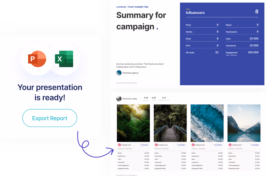 Generate editable, well-organized decks in minutes, not hours. Add media, metrics, custom text and branding, then export to PPTX, XLS or share as a link. Present results with confidence and polish.